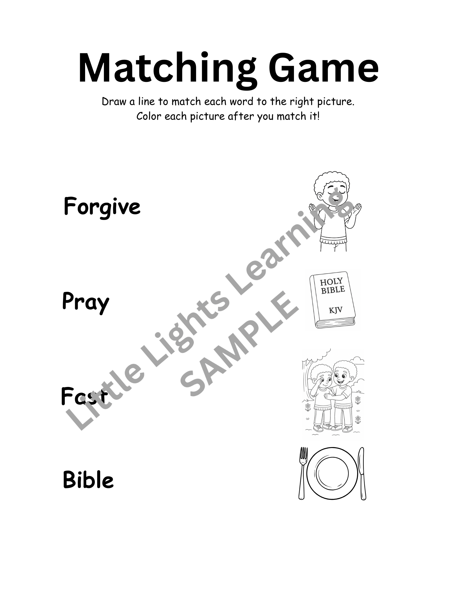 This 13-page activity book is designed with boys in mind and guides young learners through coloring, puzzles, and scripture-based lessons that emphasize fasting, prayer, forgiveness, and humbling ourselves before God.